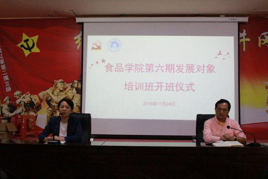 2018年11月24日,食品学院党委2018-2019学年度(总第六期)党员发展对象培训班在母瑞山开班。学院特邀党建组织员陈泰义、学院党委副书记王红英与发展对象培训班学员、学生骨干、党员代表等40余人参加。