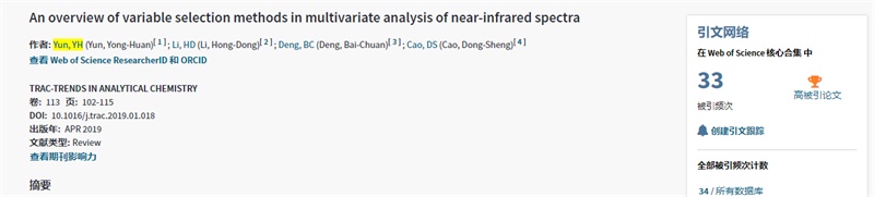 该篇论文题“An overview of variable selection methods in multivariate analysis of near-infrared spectra”,于2019年4月在JCR一区分析化学top期刊《TrAC Trends in Analytical Chemistry》(2020影响因子为9.801)正式发表(https://www.sciencedirect.com/science/article/pii/S0165993618304709)。此篇论文得到国家自然科学基金(21705162)及beat365在线唯一官网高层次人才引进科研启动项目(KYQD(ZR)-1844)的资助,这是beat365官网以第一单位发表的第三篇ESI高被引论文,充分证明beat365官网科研实力的不断提升。