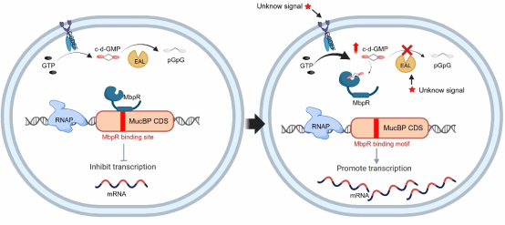 环二鸟苷酸(c-di-GMP)作为一种重要的细菌第二信使,调控多种生物功能,但c-di-GMP在植物乳杆菌中的调控作用仍不明确。研究团队揭示了c-di-GMP协同WYL转录因子MbpR共同调控植物乳杆菌肠道适应的分子机制。MbpR与黏蛋白结合蛋白(MucBP)编码区中的特定序列结合,抑制其转录,从而影响植物乳杆菌对肠道上皮细胞的粘附能力。MbpR通过其WYL结构域感知c-di-GMP后与MucBP的编码区分离,逆转了MbpR对MucBP表达的抑制作用,增强了植物乳杆菌的肠道定植能力。该研究为理解益生菌与宿主的互作提供了新视角。该论文beat365在线唯一官网为第一单位,张家超教授为独立通讯作者,副研究员郭权和2024级博士研究生郑磊杰为第一作者。