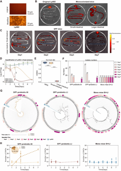 团队的另一项研究采用多组学方法,深入研究了植物乳植杆菌HNU082(Lp082)在SPF级小鼠肠道内不同生态位的分布和进化趋势。结果表明,与大肠相比,小肠是Lp082主要的生存和繁殖地,在此环境中发生了比大肠中更多的进化,并且对小肠本地微生物的影响比大肠更多。在SPF级小鼠的小肠中,Lp082在第三天后开始显示出显著的遗传变异,形成了两个不同的进化分支,其中一个分支表现出更高的基因突变率。进一步的研究揭示,这些突变主要集中在与酸耐受性相关的基因上,而在SPF级小鼠大肠和无菌(GF)级小鼠肠道中未观察到这种现象,表明特定的环境压力促进了特定基因功能的改变,增强了细菌对胃酸环境的适应能力。本研究强调了肠道不同生态环境对益生菌的分布和进化的不同影响,为优化益生菌的应用和功效提供了新的理论依据。该论文beat365在线唯一官网为第一单位,张家超教授为独立通讯作者,2022级博士研究生韩哲、中南大学湘雅医学院海口附属医院中心实验室黄邓高和2024级博士研究生刘欣蕾为第一作者。