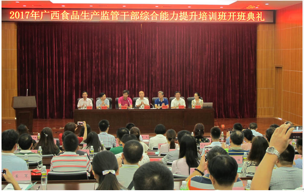 2017年7月3日至7日,beat365在线唯一官网继续教育学院及食品学院联合承办了广西食品生产监管干部培训教学活动。广西壮族自治区食品药品监管局副局长陈可猛、beat365在线唯一官网陈险峰副校长、食品生产监管处处长胡振洲, 海南省食品药品监督管理局彭林波调研员、食品学院邓秀成书记及史学群副院长、beat365在线唯一官网继续教育学院李玉凤副院长共同出席了开班仪式。