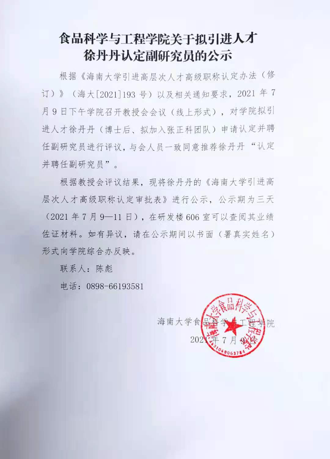 beat365在线唯一官网关于拟引进人才徐丹丹认定副研究员的公示