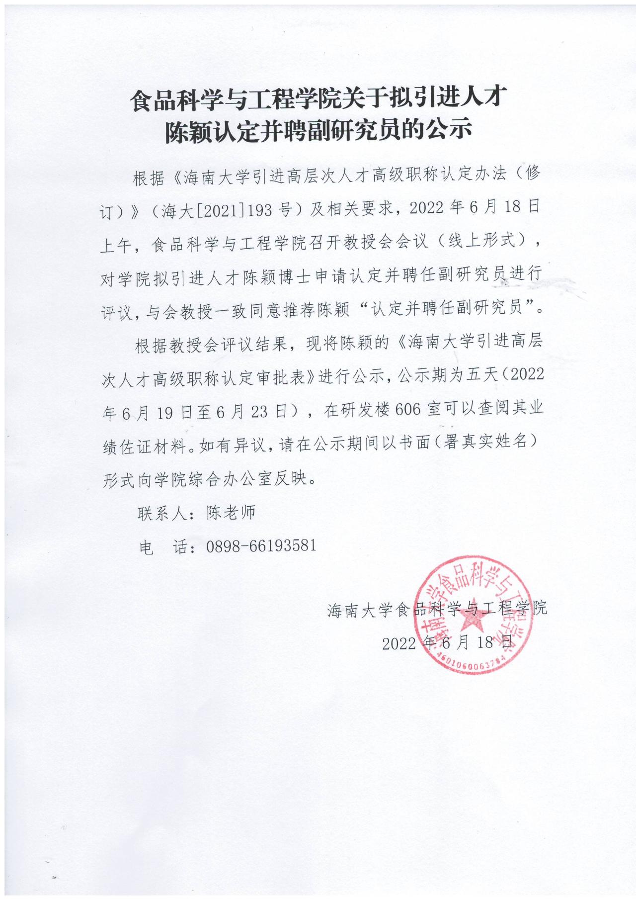 beat365在线唯一官网关于拟引进人才陈颖认定并聘副研究员的公示